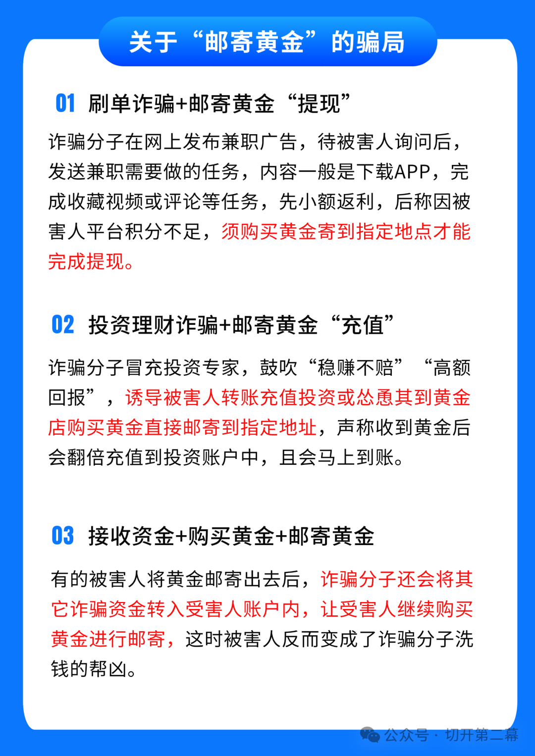 黄金洗钱诈骗作为2025年的新套路,骗子冒充投资平台客服,要求受害者购买金条并快递至指定地点,以此洗钱。无锡老王受骗购买大量金条寄出,却不知已落入骗子圈套。这类骗局利用了黄金交易的特殊性,以及人们对投资平台的信任,实施诈骗。