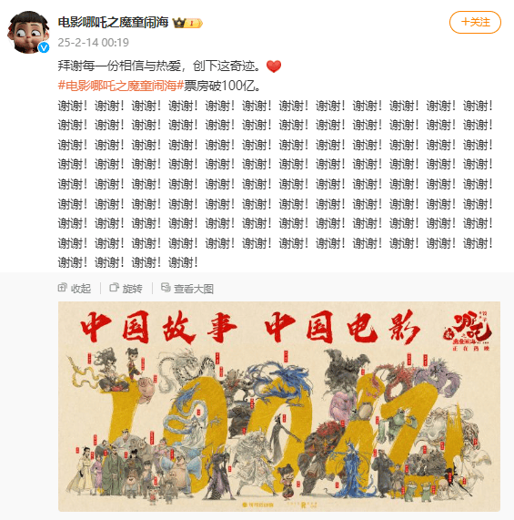 2月14日凌晨,官方微博账号@电影哪吒之魔童闹海连发100个“谢谢”字样,并附文表示:“感谢每一位观众的支持与喜爱,创造了这一奇迹。”