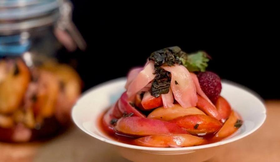 比如,切成月牙状的脆桃,搭配冰糖、白醋、紫苏和姜片,腌制后取出来吃,那叫一个酸甜可口。