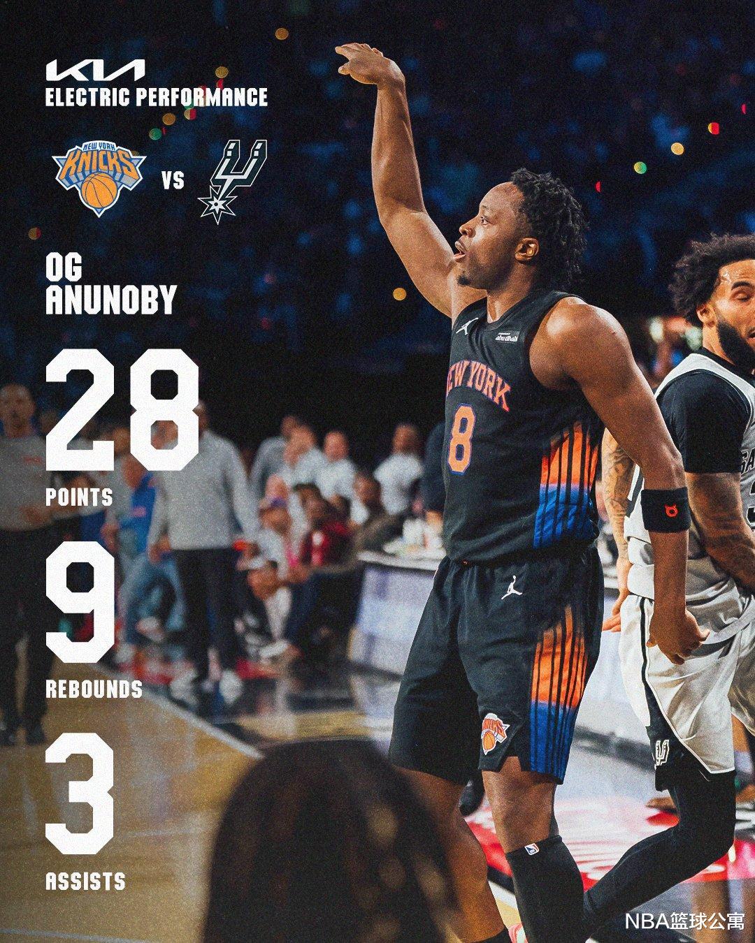 阿奴诺比暴走尼克斯队锋线巨头OG阿奴诺比,在此役迎来了暴走。阿奴诺比上场40分钟,17中10,三分10中5,罚球5中3,狂轰28分9篮板3助攻的全能数据,正负值+7。阿奴诺比以59%的命中率轰下了全场的最高分,在进攻端火力全开。并且,阿奴诺比还以50%的命中率投进了此战最多的5记三分。上半场10中8砍下了20分的阿奴诺比,在首节和次节各得10分。