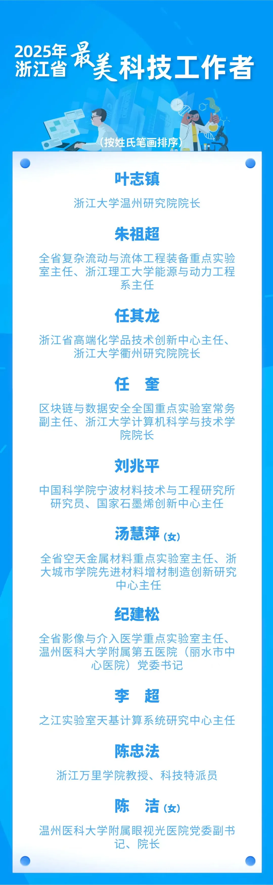 据悉,2025年浙江省“最美科技工作者”宣传选树活动自启动以来,得到了社会各界广泛关注,共产生10位“最美科技工作者”。