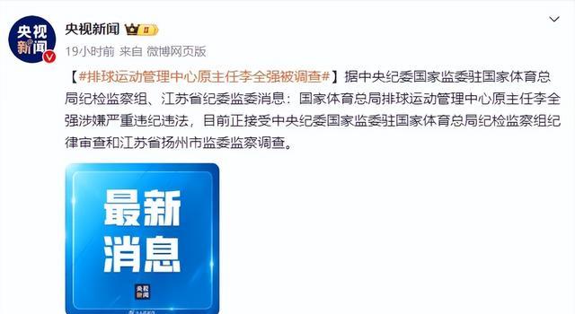 就在近日,央视新闻发表声明表示:据中央纪委国家监委驻国家体育总局纪检监察组、江苏省纪委监委消息:国家体育总局排球运动管理中心原主任李全强涉嫌严重违纪违法,目前正接受中央纪委国家监委驻国家体育总局纪检监察组纪律审查和江苏省扬州市监委监察调查。