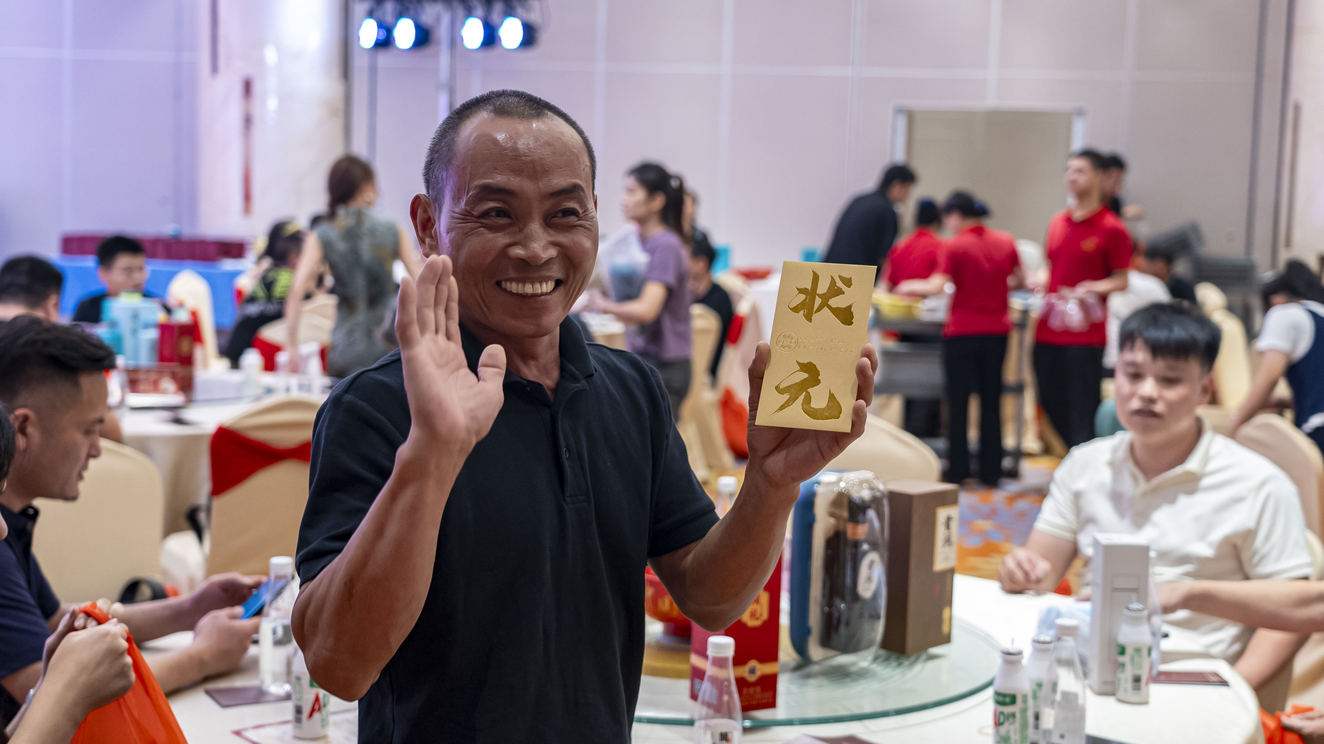 闽南特色的博饼环节,是这场盛会中“团圆”的最佳载体。作为国家级非物质文化遗产,博饼承载着 “祈福、欢聚” 的寓意,当骰子在碗中碰撞出清脆声响,笑声、尖叫声、欢呼声此起彼伏,各桌状元上台合影、全场大合影的瞬间,定格下黔致家人“月圆人团圆”的浓情与温馨。