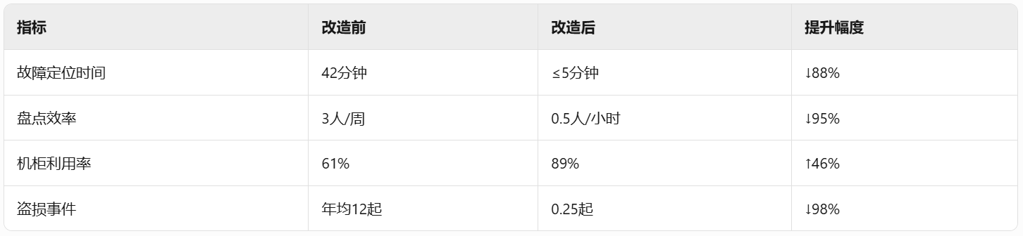 技术对比实验显示:普通RFID在金属机柜环境定位误差±5U,而MC-RFID实现±0.5U精度,提升达10倍。
