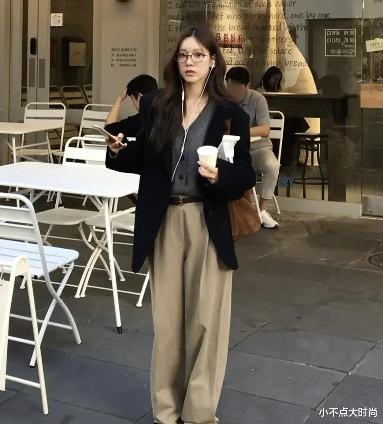 基础款的黑色西装,搭配基础款灰色针织衫、卡其色的高腰阔腿裤,面料质感好,穿搭就很显品味,利落又不失松弛感,不费力的高级感。▼