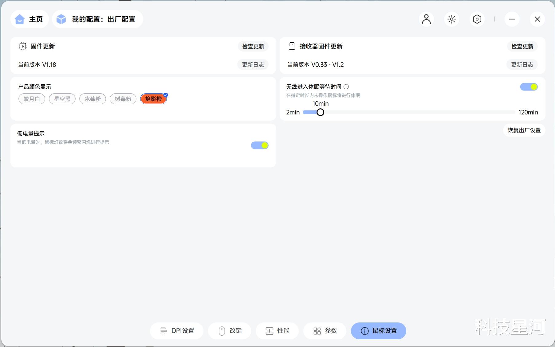 同时还能调节鼠标回报率,根据游戏需求切换性能模式,涵盖办公、火力、超核、竞技超核等多种使用模式,不同模式对应不同功耗与性能表现,还可通过续航计算器直观查看不同模式下的续航时长。