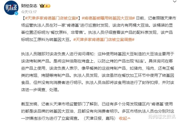 最近,天津的肯德基摊上事儿了!市场监管部门突击检查发现,多家肯德基门店被立案调查,原因竟然是——使用了转基因大豆油,而且没告诉咱消费者!这一下炸开了锅,大家都在讨论,转基因大豆油到底能不能吃?肯德基这样做到底合不合理?今天就来跟大家好好唠唠这件事儿。