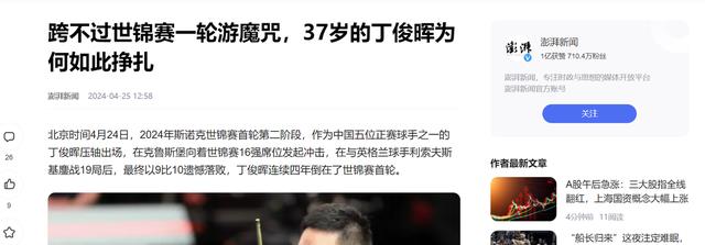 【3】澎湃新闻,2024-04-25,“跨不过世锦赛一轮游魔咒,37岁的丁俊晖为何如此挣扎”.
