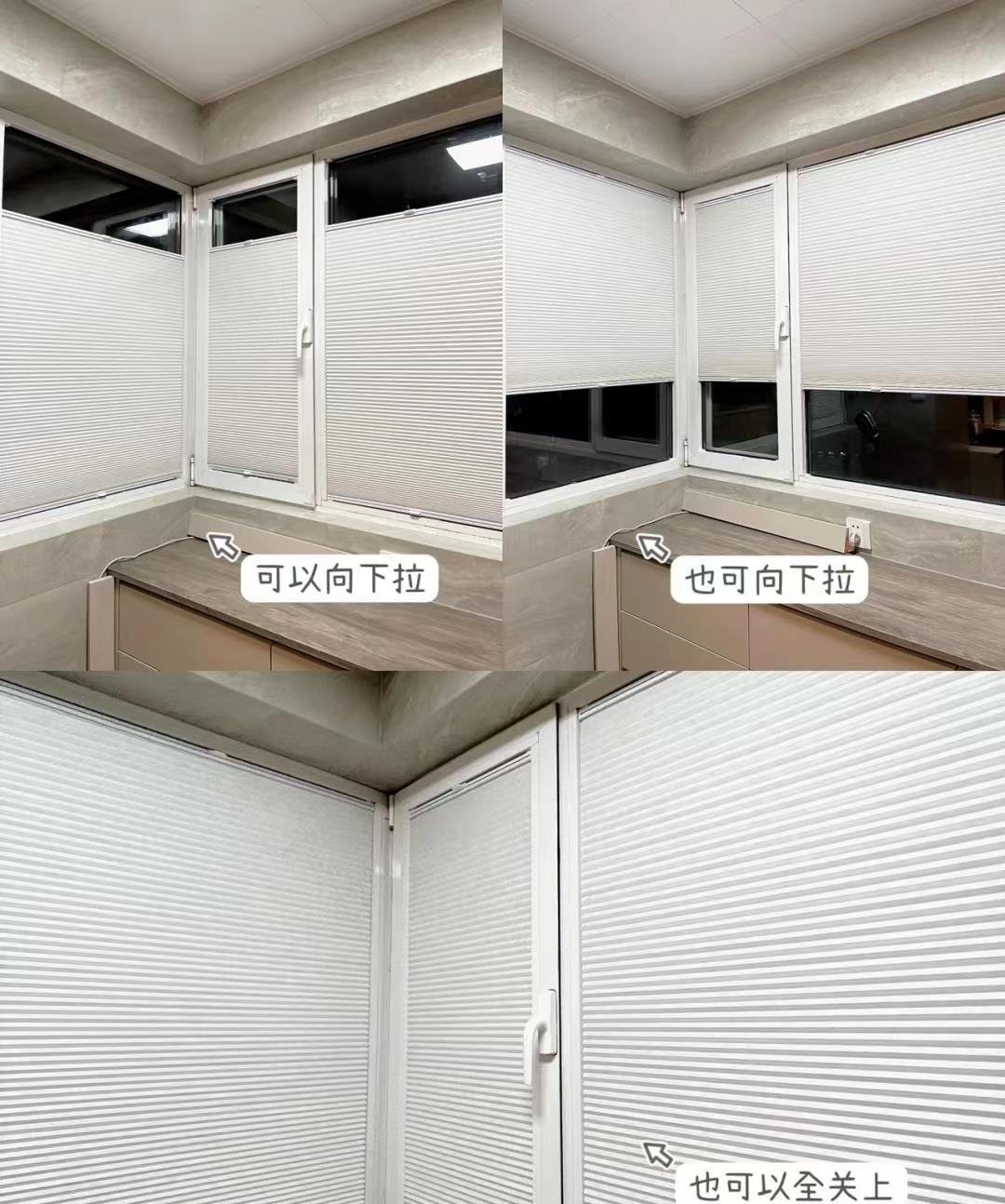 蜂巢帘的开合方式也比较灵活,竖着装可以上下开合,横着装可以左右开合,想遮哪就遮哪,比传统的窗帘要灵活方便。