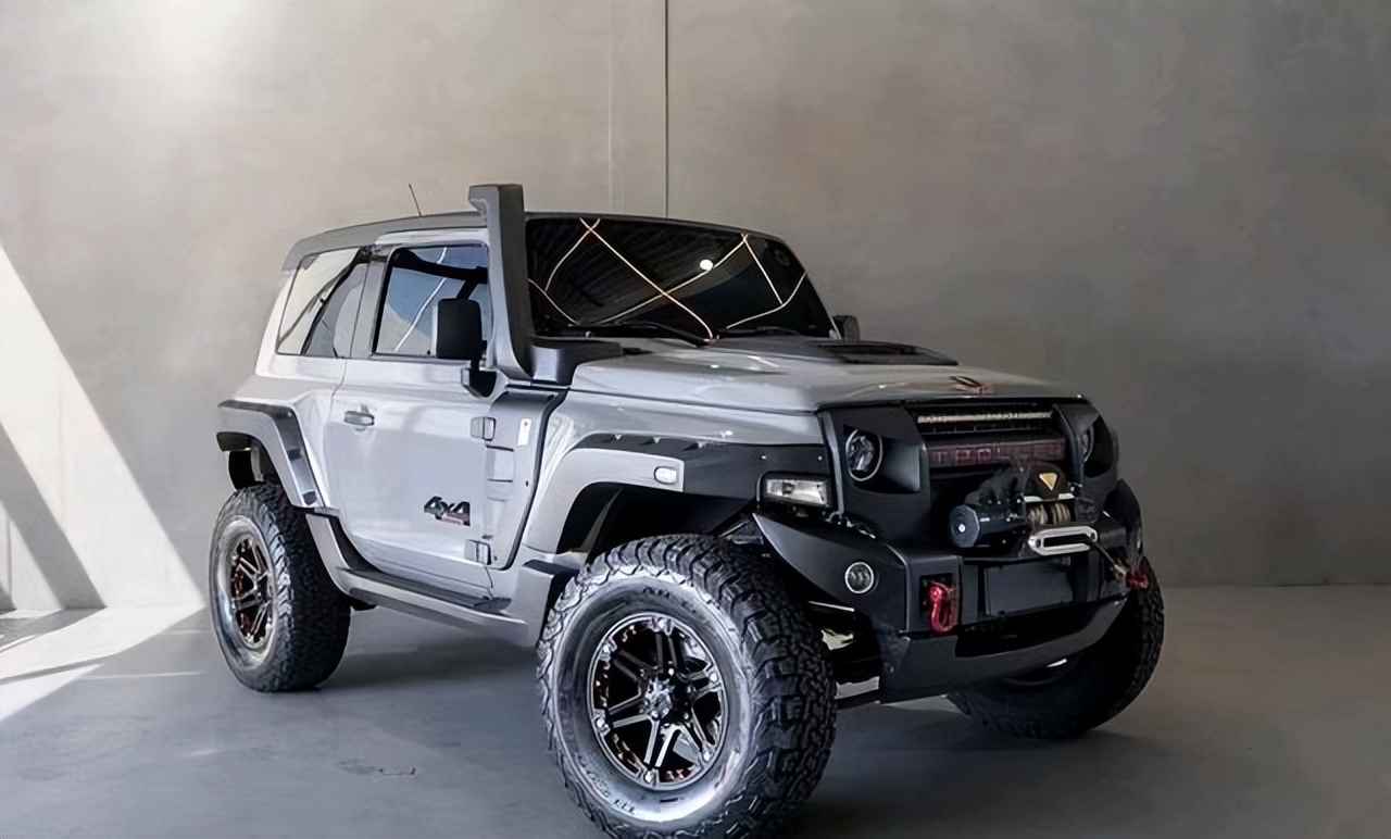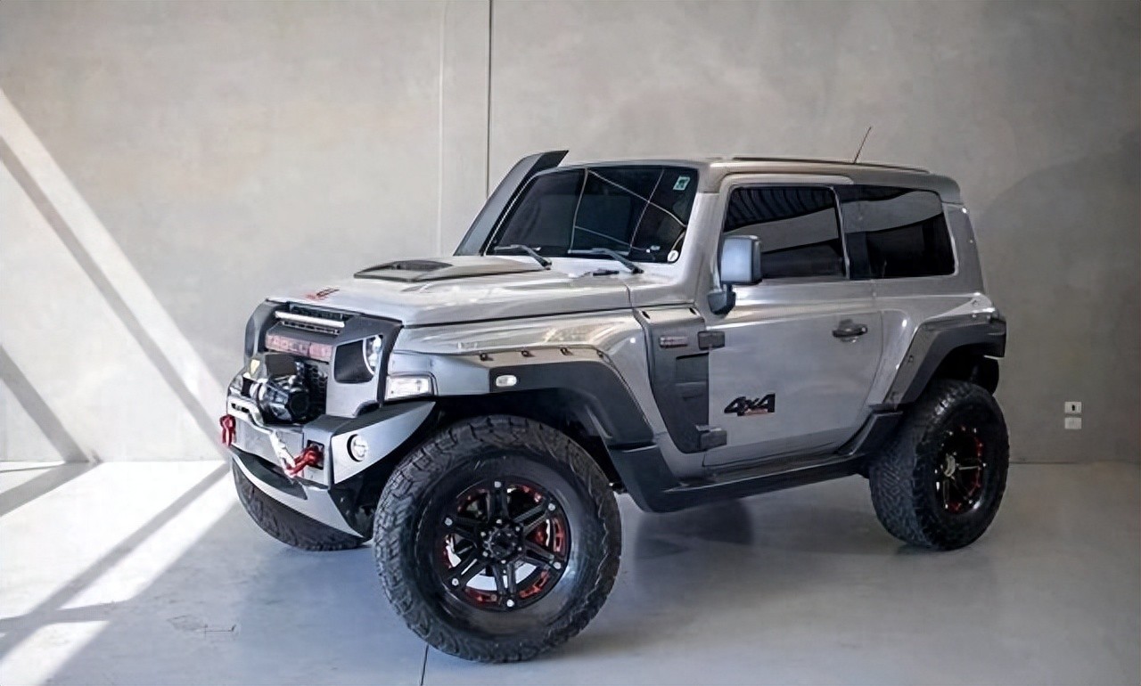 我们首先来看新车的外观设计方面,新车的车头部分整体为全新的家族式造型设计,机盖整体为隆起明显的造型,中央还有着立体的进气口设计来增加越野定位,下方中网部分为突出的熏黑饰板包裹,两侧圆形的大灯组也是与牧马人造型相似,照明效果以及辨识度都是得到了提升,中央还有着大尺寸的电动绞盘设计,以此来增加越野定位以及脱困能力,保险杠部分为竞技式造型,两侧的轮胎部分 有着较高的离地间距,并且加上底部的熏黑护板造型,整体运动感更加出众。