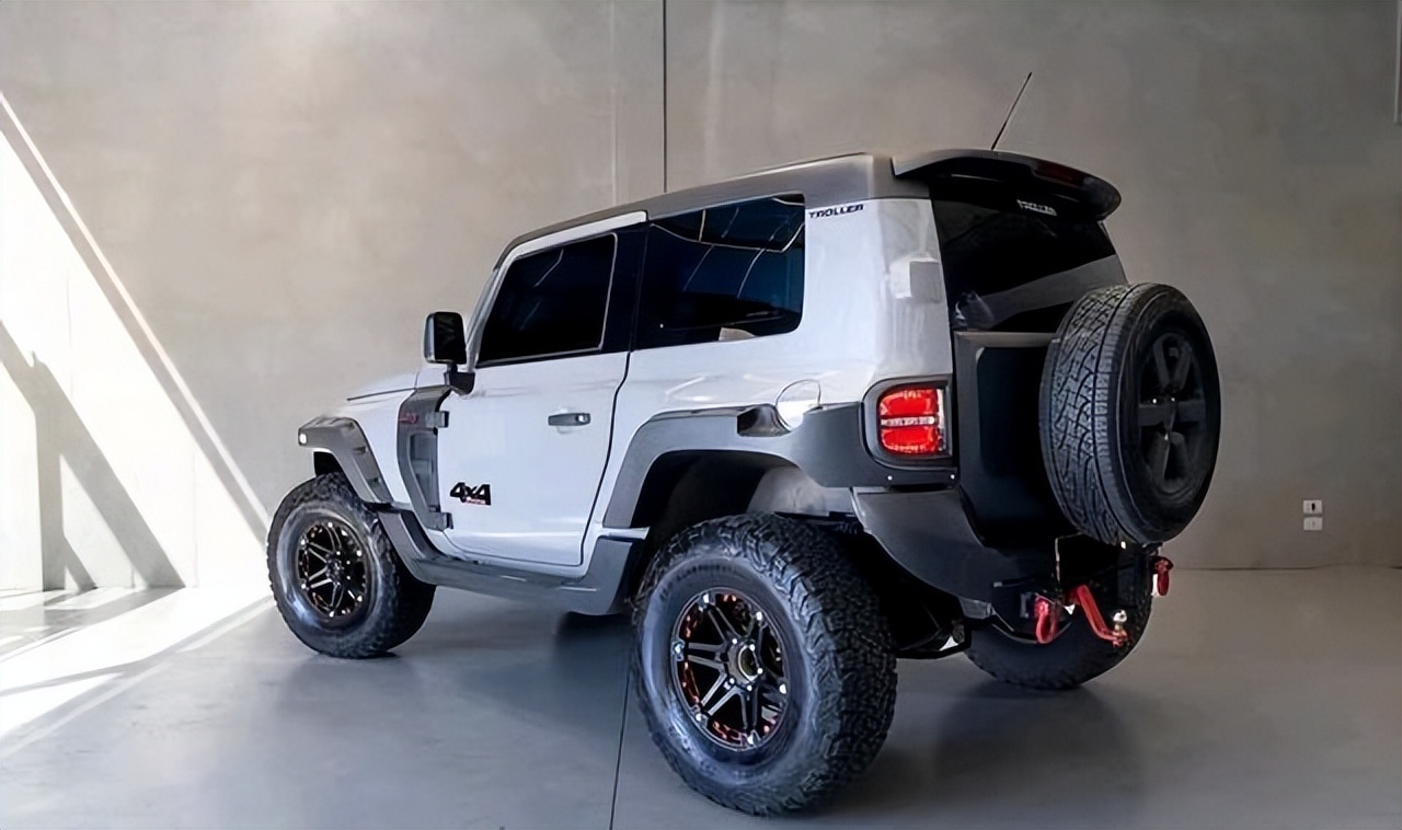 车尾部分的造型短小且紧凑,车顶有着突出且上翘明显的熏黑扰流板设计,就像是尾翼一般来增加运动感,下方尾门应该是侧开式造型,中央悬挂有全尺寸的备胎设计,看起来也是很粗犷的,而两侧的尾灯面积很大,四周也是黑色饰板的包裹来增加立体感,保险杠与车头造型相呼应,红色的拖车环以及拖车钩的设计都是彰显了新车越野SUV的定位。