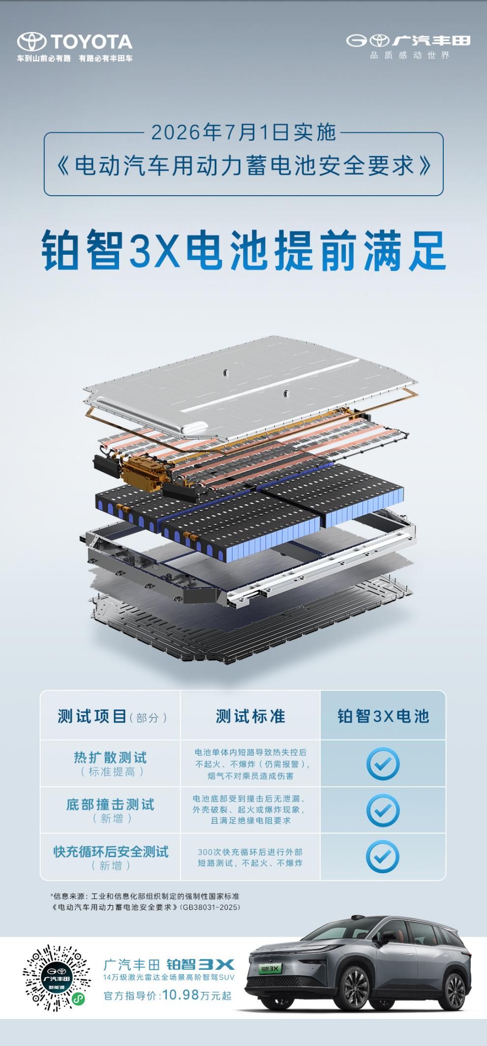 面对这场堪称“大考”的标准升级,广汽丰田铂智3X脱颖而出,提前16个月完成了这场挑战。正如央视采访中彭总对铂智3X电池组的权威解读,这款车型已率先完成标准升级挑战,展现出硬核技术实力。