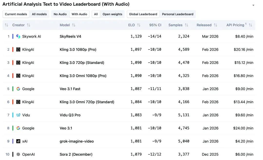 Artificial Analysis 是目前业内最具公信力的 AI 模型评测平台之一,其视频榜单采用公开竞技场机制,由全球真实用户进行盲测对比,通过大量 Elo 积分制两两比较计算排名,更能反映模型在真实场景中的综合表现。