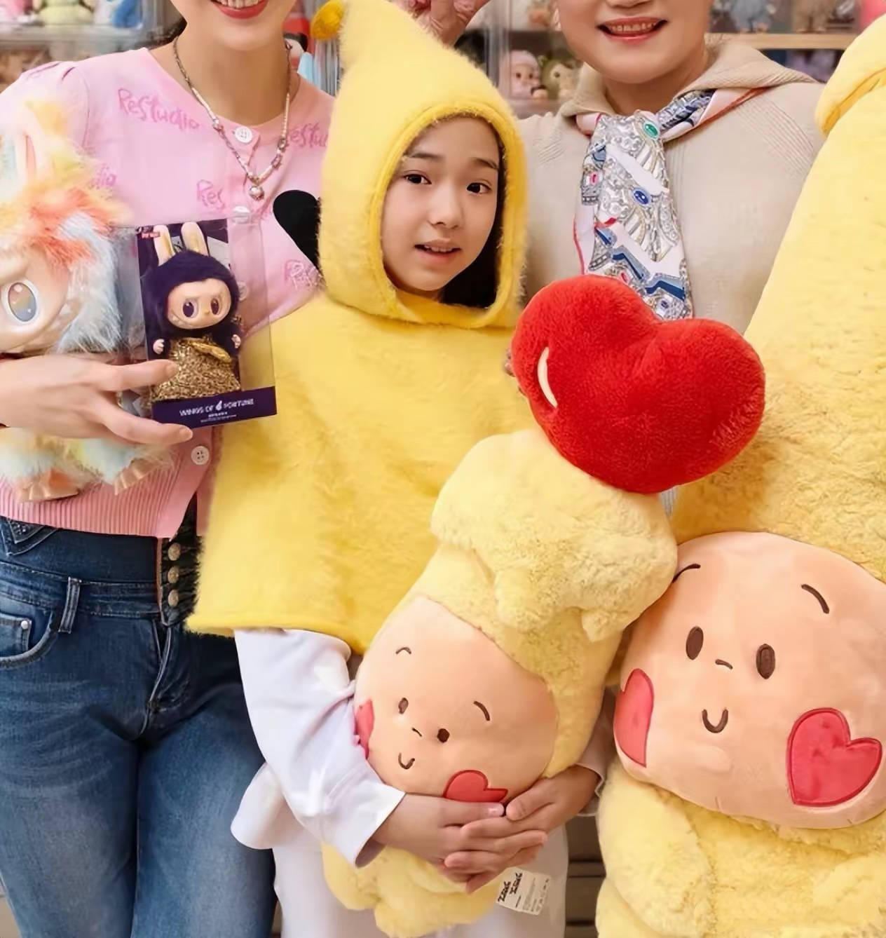 他们拍照的位置,是一面手办墙。这里应该是专属小酒窝的快乐天地,小酒窝当天穿着黄色卡通上衣,和两位亲友合影,可可爱爱的。