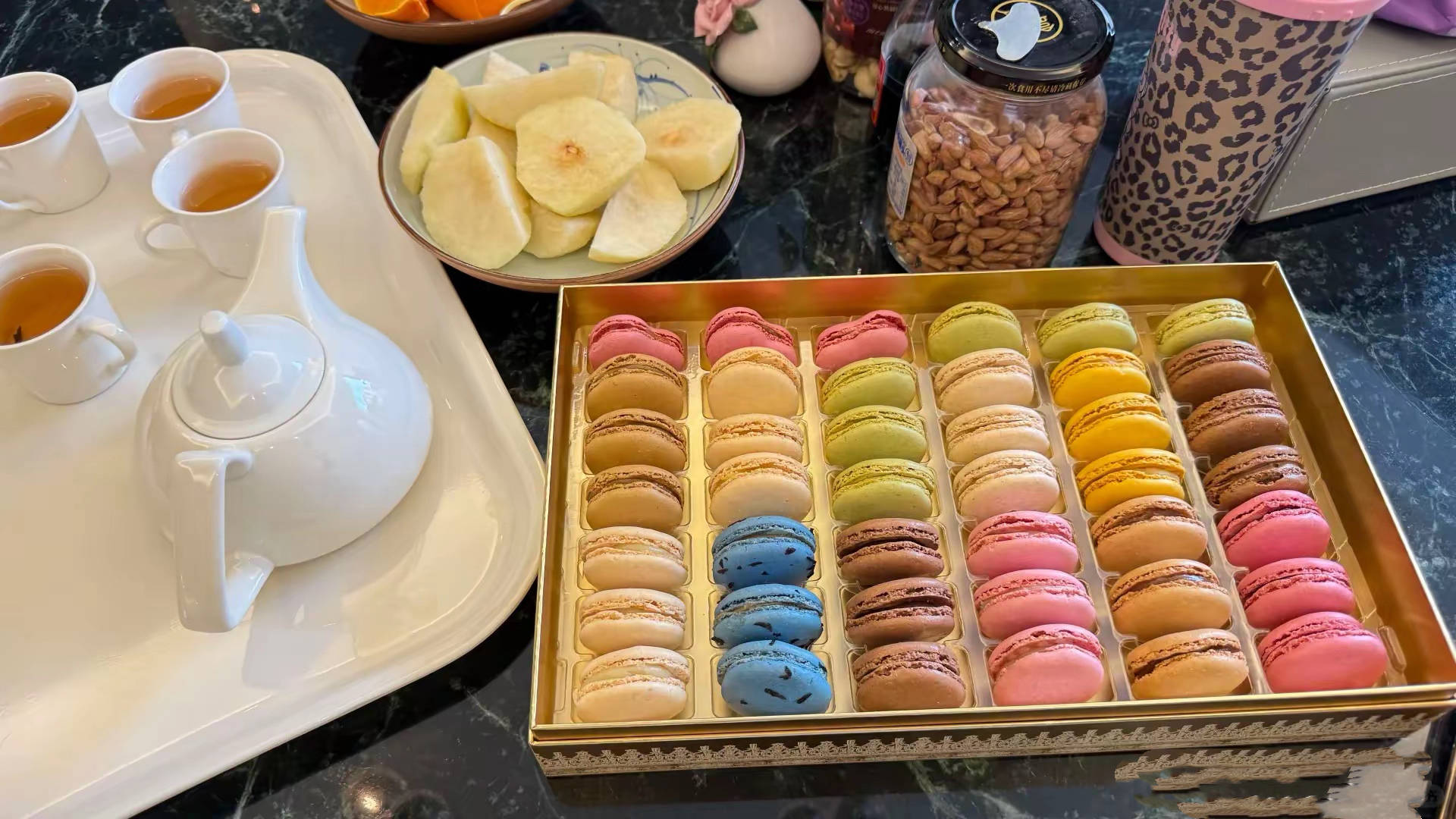 网友还晒出了董璇家里的待客茶点,有好看的马卡龙、还有水果、下午茶,不管是茶具、还是食物,都主打一个精致。