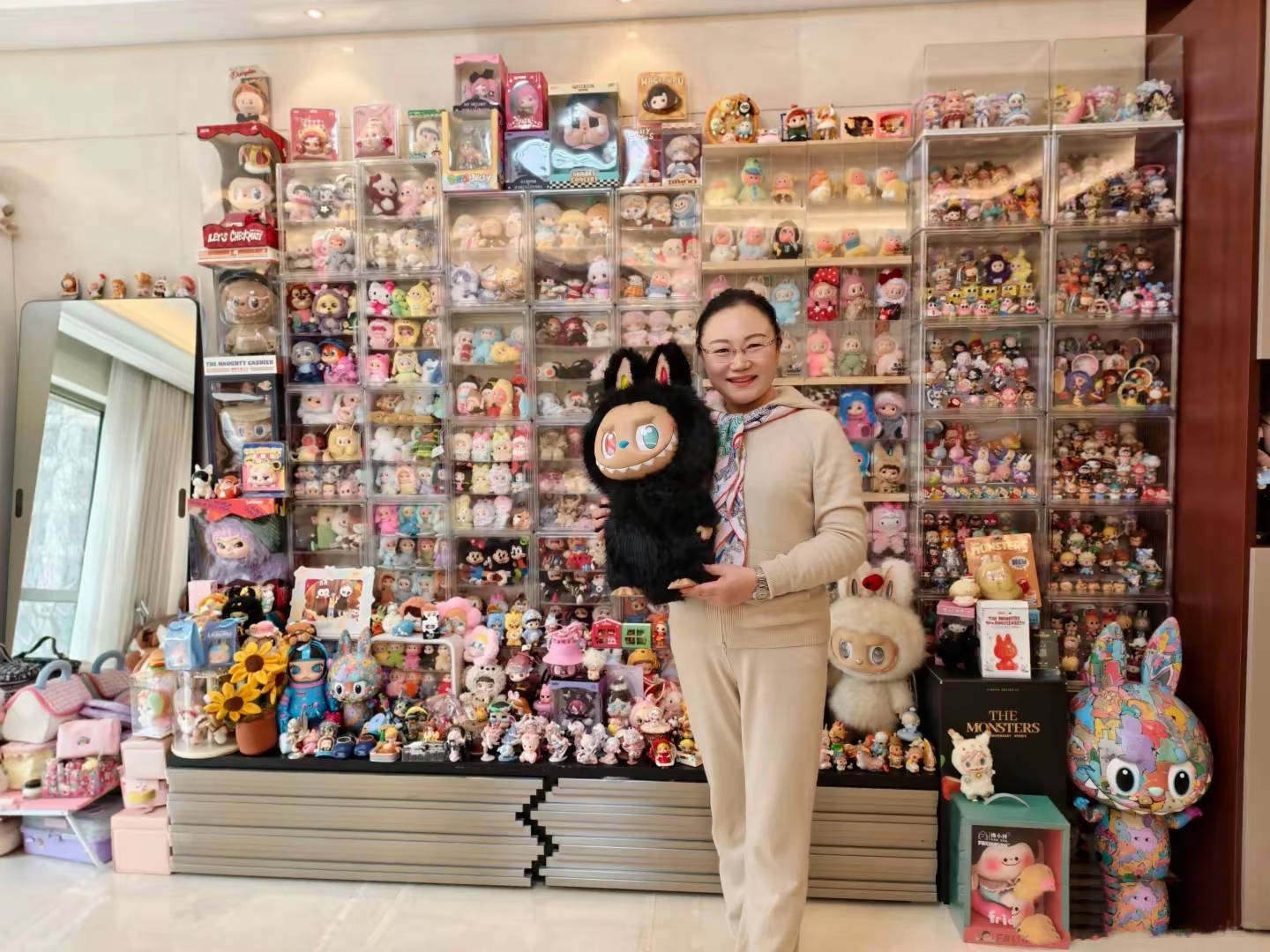 拿到小酒窝礼物的老师也是非常开心,也许老师不是很喜欢拉布布,但这是小朋友的心意。在这样的手办墙面前拍照,真的是很震撼。