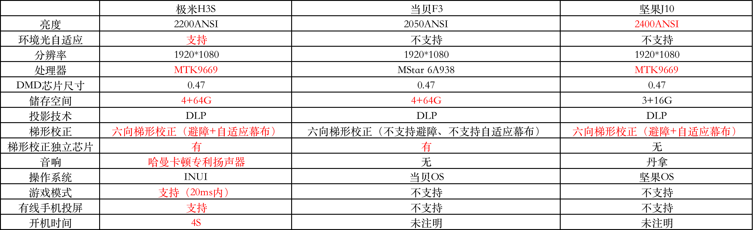 极米这款新品H3S很明显是家用智能投影旗舰价位的有力竞争者,还是很有必要简单就现在市面上的一些产品来进行一个对比,话不多说,先拉一张参数图: