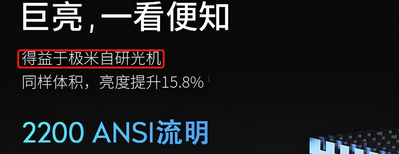 其中特别提到了亮度提升方面来自于自研光机,其实之前各家智能投影厂商的“亮度竞赛”都显得很没有底气。明明都是一样的DMD芯片尺寸,能承受的光通量差不多,亮度不会有太大差距,还要比个高低,让人摸不着头脑,不知道这次自研光机能否带来真正实质性的亮度提升。