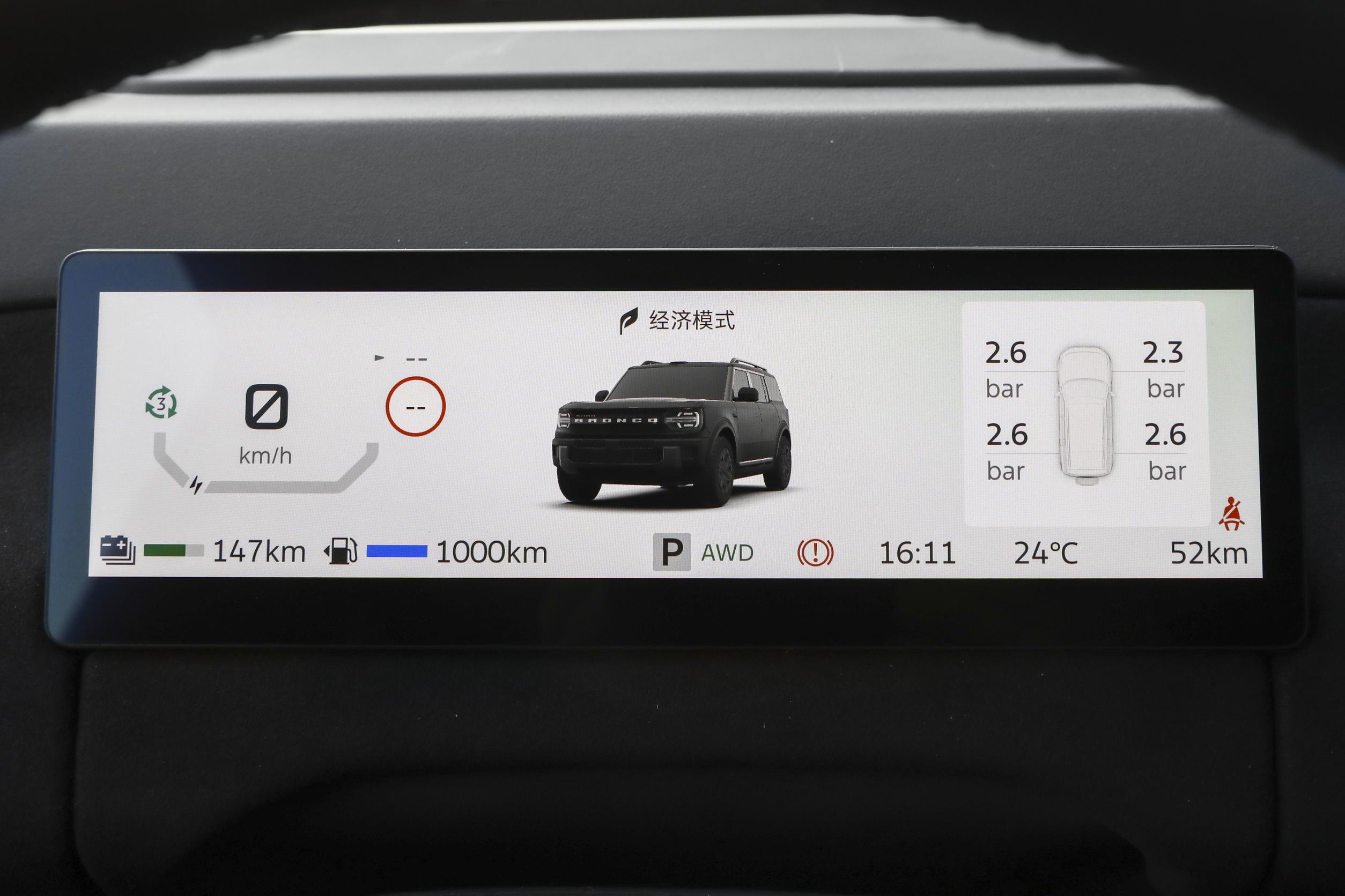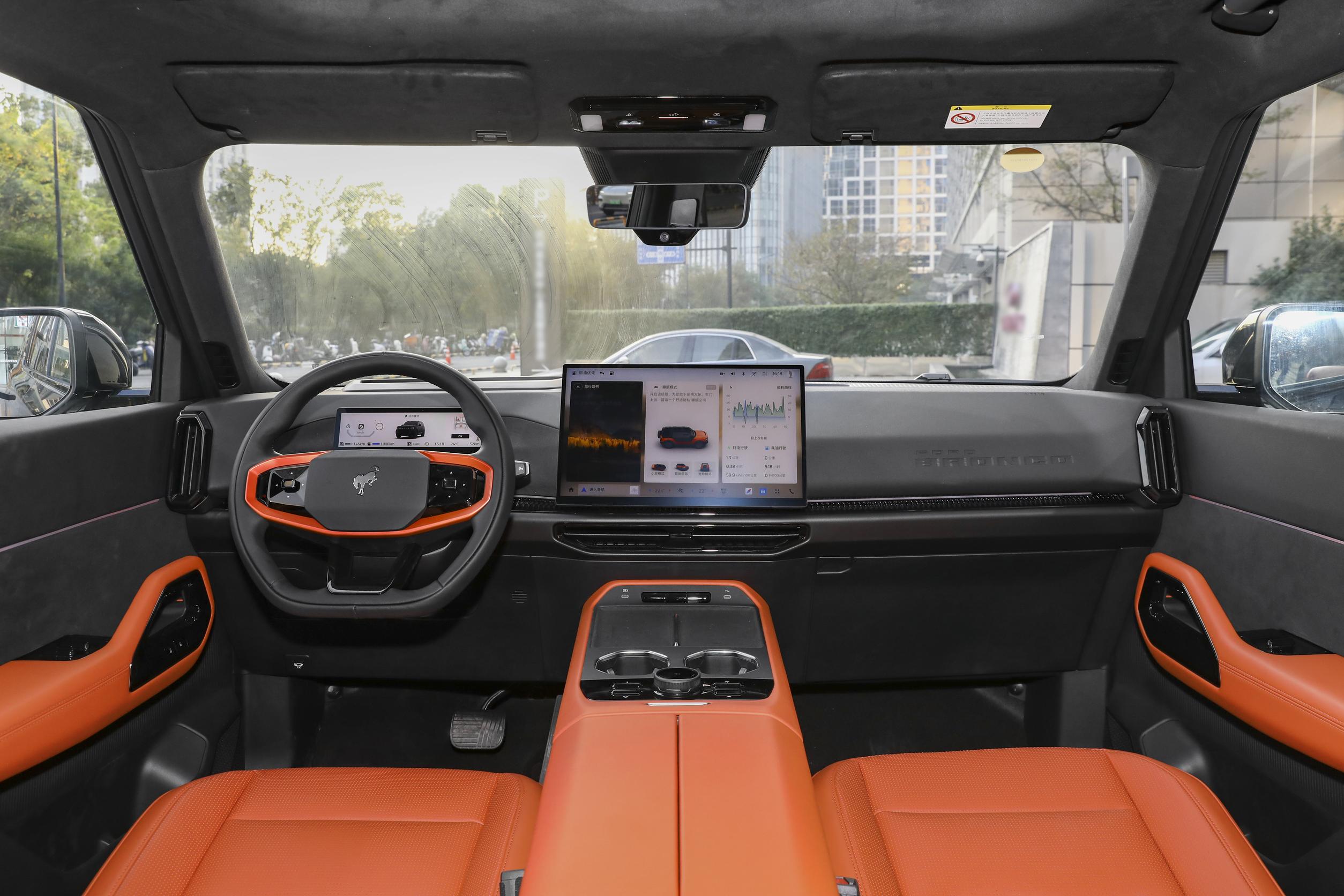 进入车内,内饰设计走的是简洁实用路线,没有过多复杂的装饰,配色有月壤灰、密林绿、赤沙橙三种可选,我体验的密林绿内饰,和户外场景很搭,质感也不错。方向盘是三幅平底造型,握感饱满,运动气息足,副驾驶侧的“BRONCO”字母车标,悄悄彰显了车型身份。车内保留了不少实体按键和旋钮,主要集中在空调控制和驾驶模式切换区域,盲操作很顺手,比全触控屏更实用,尤其是在行驶过程中,不用分心找按键。怀挡机构是标配,节省了中控区域的空间,下方还设计了双杯架和手机无线充电面板,日常使用很方便。