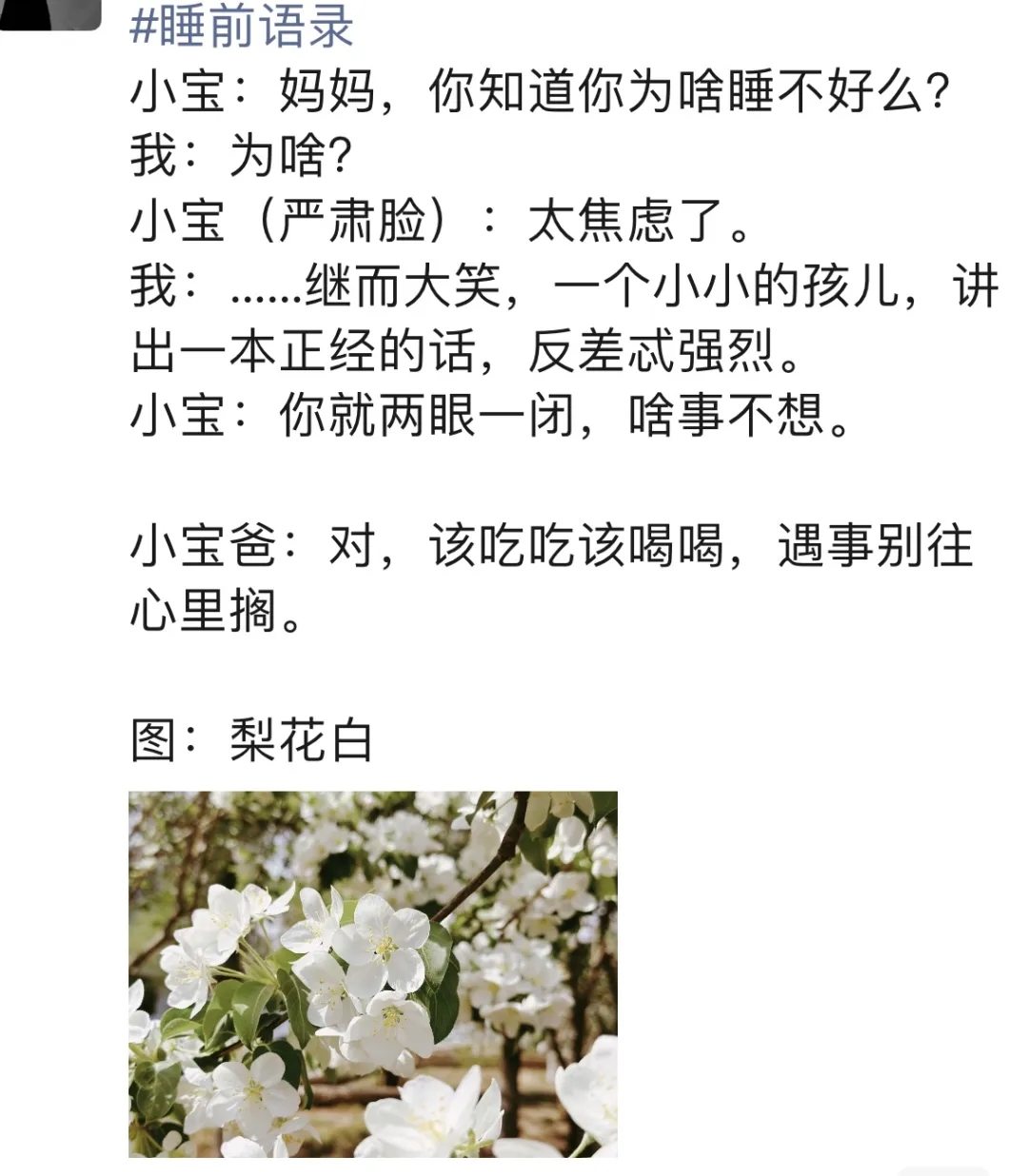 好了,关于昨晚失眠,我还有很多奇思妙想,但是不能说了。但是!我衷心祝愿大家天天好眠,心想事成。最后po上家人们睡前对话👇:
