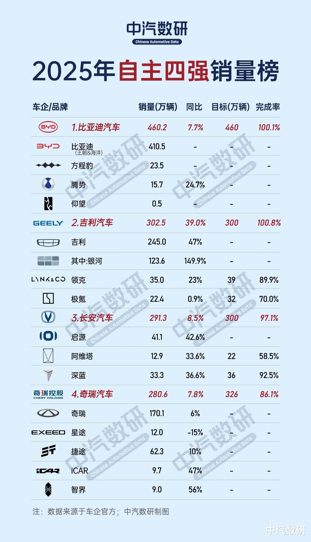 2025年中国车市收官战落下帷幕,自主车企阵营的竞争格局再次清晰浮现。作为行业标杆的比亚迪、吉利、长安、奇瑞四大自主龙头,全年销量成绩单正式出炉,有的精准达标再创辉煌,有的虽未圆满却仍创纪录。今天我们就来分析一下这四家车企的2025年销量表现及目标完成情况。