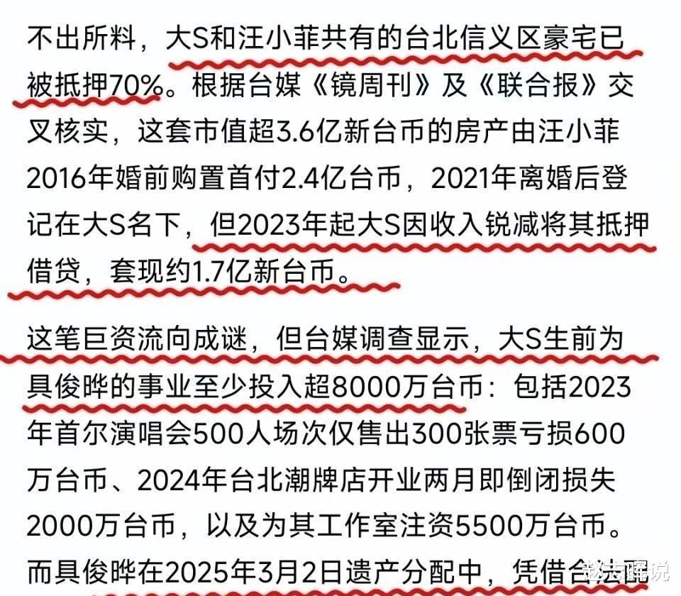 其次,具俊晔与大S生前的贷款问题也浮出水面。有消息称,大S的豪宅贷款高达上千万新台币,具俊晔的朋友爆料称,这笔贷款至今未解决,而具俊晔却对外宣称自己“已经承担了责任”。更糟糕的是,大S复出拍广告赚的钱,不少流入了具俊晔的演唱会和潮牌店,结果这些项目纷纷失败,导致资金打了水漂。一位网友直呼:“具俊晔这波操作,简直是把大S当提款机啊!”
