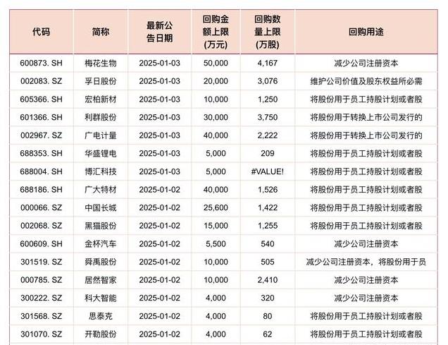 其中,永泰运和海康威视分别以25亿元和20亿元的回购上限领先,展现了其对公司未来发展的坚定信心。此外,丽珠集团、力生制药、华安证券等公司也宣布了回购计划,金额上限从2亿元到10亿元不等,进一步丰富了回购市场的活跃度。