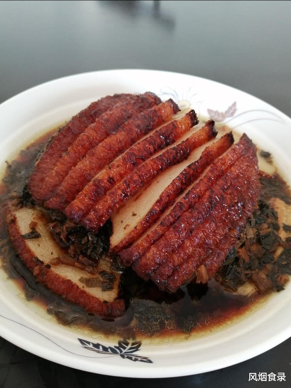 肉选三肥七瘦五花,煮至七成熟涂老抽,皮朝下炸出虎皮皱,再切片垫梅菜干蒸两时辰。