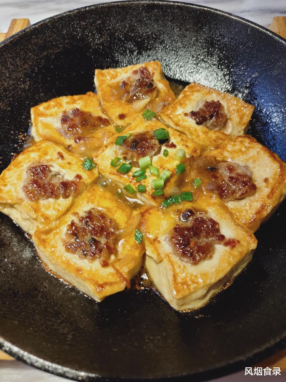 肉馅得是肥瘦相间的猪前腿肉,掺香菇、虾米,手工剁碎塞进豆腐里,先煎得金黄,再焖得入味。