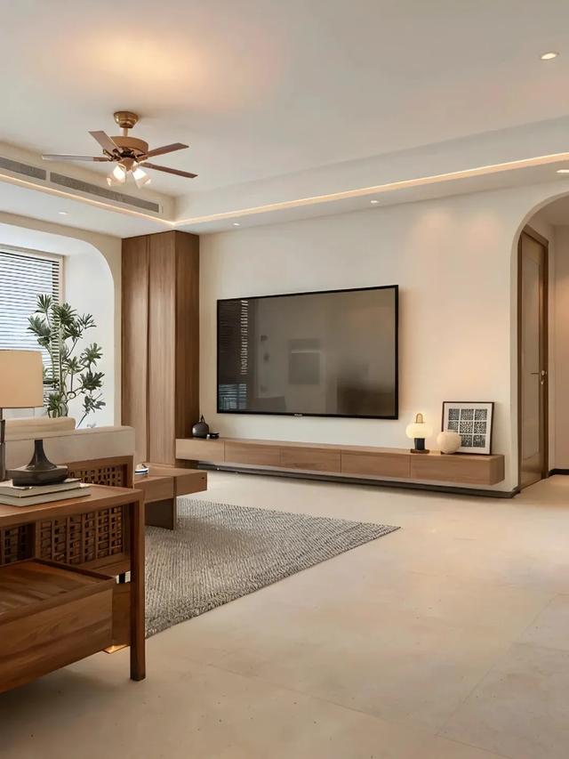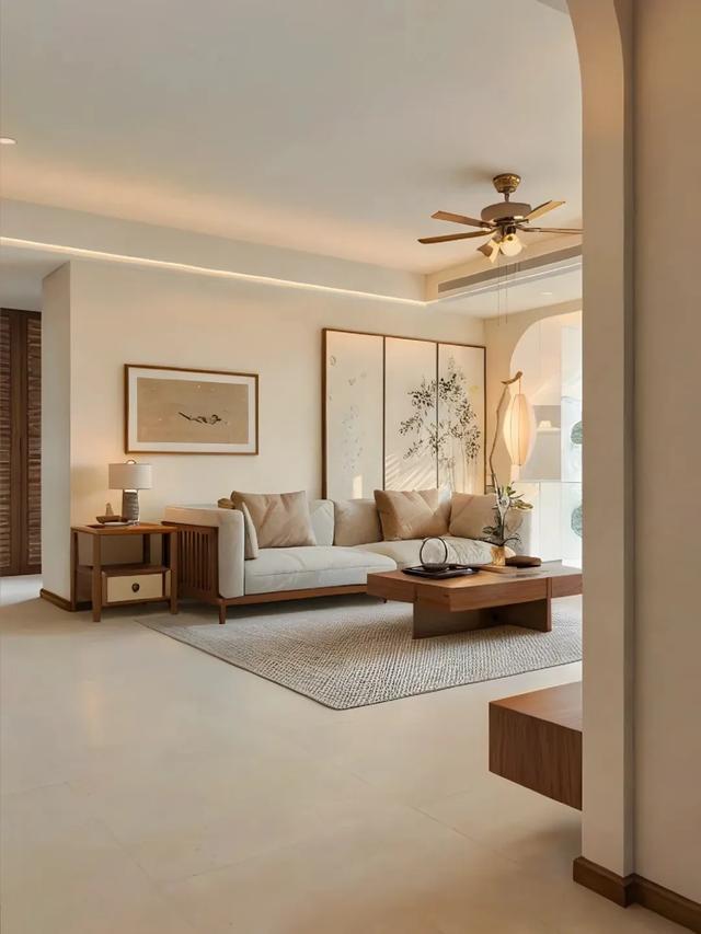 家具配得也是刚刚好。一张米白色布艺沙发,看着柔和、坐着舒服。边几、茶几都选了矮款原木色,和沙发组合在一起特别协调。背景墙上水墨屏风,枝叶与山林之间,透着点文人气息。吊扇灯轻轻转着,复古又不显老气,审美拿捏得死死的。