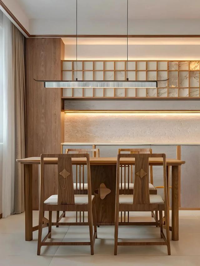 四把高背木椅、原木大餐桌、背后还有石材和格栅交错做背景,低调中透着质感。仪式感这块,新中式从不缺席!