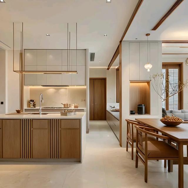 岛台竖向格栅和天花的木线条呼应得刚刚好,一眼看过去,整个空间都特别有秩序感。吊灯选得也妙,简约轻盈,刚好提个亮,但不打扰整体风格。