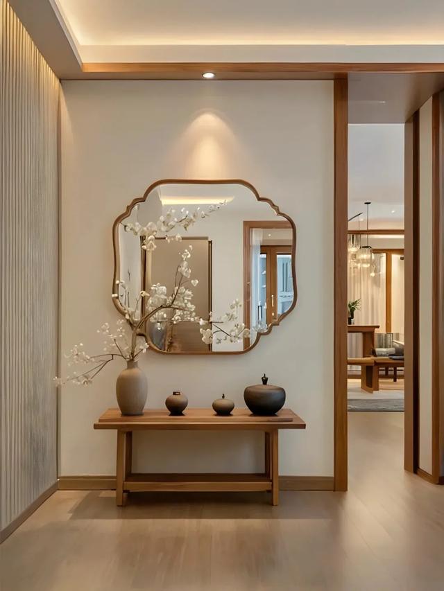 爸妈说,家是安静的港湾。所以玄关就搞了个“入则静”的氛围。整体对称布局,原木色调超级温润。中式花窗造型,不仅实用,还特别有范儿。下面搭配一张木案,陶器+花枝+氤氲灯光,简直像走进了一幅中式静物画。