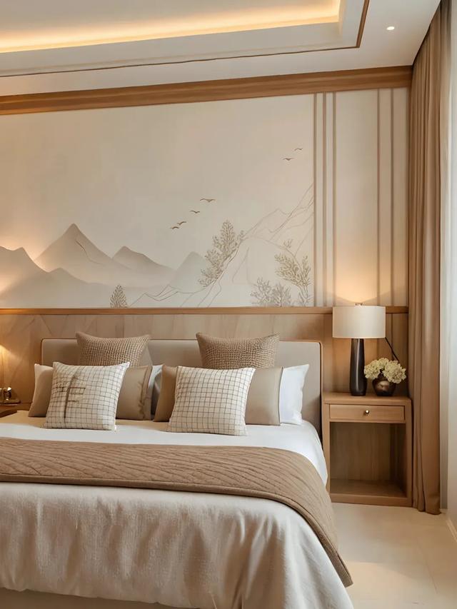 床品用了浅色+棕组合,看着就很舒服。床头柜简洁实用,放一瓶白色绣球花,柔和得像水墨画。床尾还挂了幅淡墨山水,视觉重心刚好。