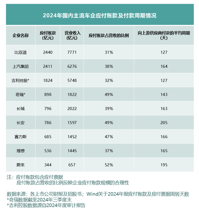 应付账款也是衡量企业运营健康的重要指标,应付账款占营业成本比例越低,企业未到期支付供应商货款的比例就越低。国内主流车企中,比亚迪应付账款占营业收入比例为31%,且付款周期仅127天,体现出强大的供应链管控能力。