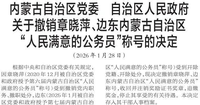 当天《内蒙古日报》2版刊发《内蒙古自治区党委 自治区人民政府关于撤销章晓萍、边东内蒙古自治区“人民满意的公务员”称号的决定》。