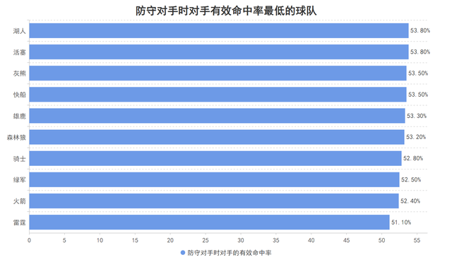 本赛季火箭防守对手时,对手的有效也就是运动战命中率为52.4%,这个防守对手时对手的运动战命中率为联盟第二低,这意味着火箭的防守既可以减少失分也可以令对手的运动战命中率达到极低的水准。