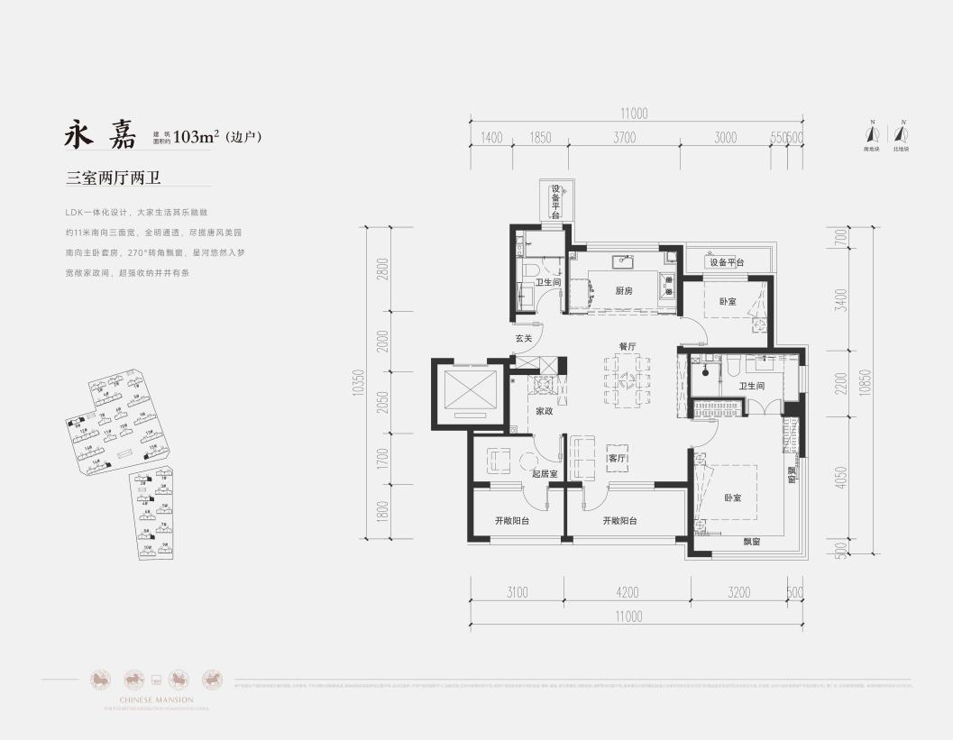 建面约103㎡朗阔三居,约11米南向面宽;近50㎡客餐厅空间感媲美市面140㎡产品,搭配全景落地窗,尽享盛唐园林景观;