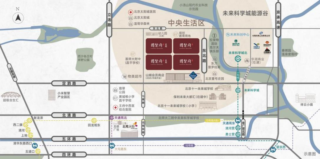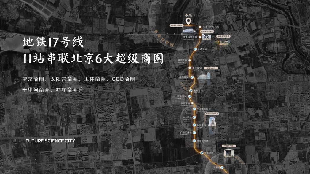 产业的发展带动区域配套升级,区域内定泗路、北清路两条科创轴线,便捷连接海淀中关村;地铁17号线黄金动脉贯穿南北,4站望京,8站直通工体,串联CBD、亦庄开发区等城市核芯区,出行便捷。