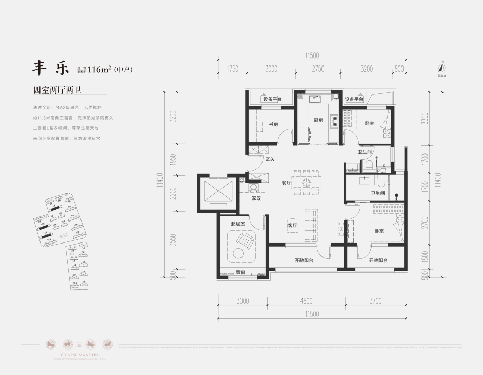 建面约116㎡四叶草四居,南向三面宽约11.5米,客厅面宽约4.8米,搭配全景落地窗,MAX级采光;主卧套房设计,面宽约3.7米,次卧面宽都在3米以上,可配置双人床。
