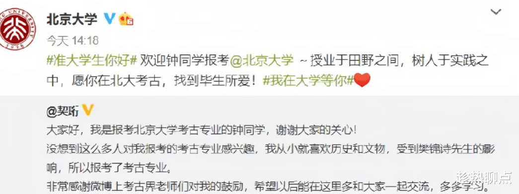今天,聊哥便带各位读者一起来捋捋这位“北大考古女孩”的故事。►.一次意料之外的选择2020年高考,钟芳蓉高考成绩676分,湖南省文科第四名。如此优异的高考成绩,一时间,网友们都在猜测她“选择北大还是选择清华”,但最终她的选择却让广大网友大跌眼镜——北大考古专业!大家的第一反应除了震惊,还是震惊,因为考古专业太冷门了,不夸张的说,冷门到大家都不知道还有这么一个专业。这个消息一经爆出,不止广大网友议论纷纷,同时也引起了考古界“大佬”们的高度关注,让她一时间“火”了起来。