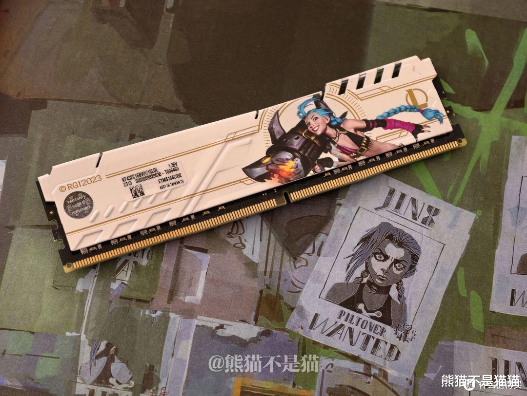 内存条的马甲上印有极具辨识度的金克丝人物印花,右侧则是醒目的 LOL LOGO。纯白的底色与蓝戟A380的白色外观简直是“天作之合”,整体视觉统一感极强。美中不足的是,作为一个联名款,它竟然不是灯条,上机后的灯效氛围稍微弱了点。好在熊猫这次的配置本身就是走纯白精致路线。