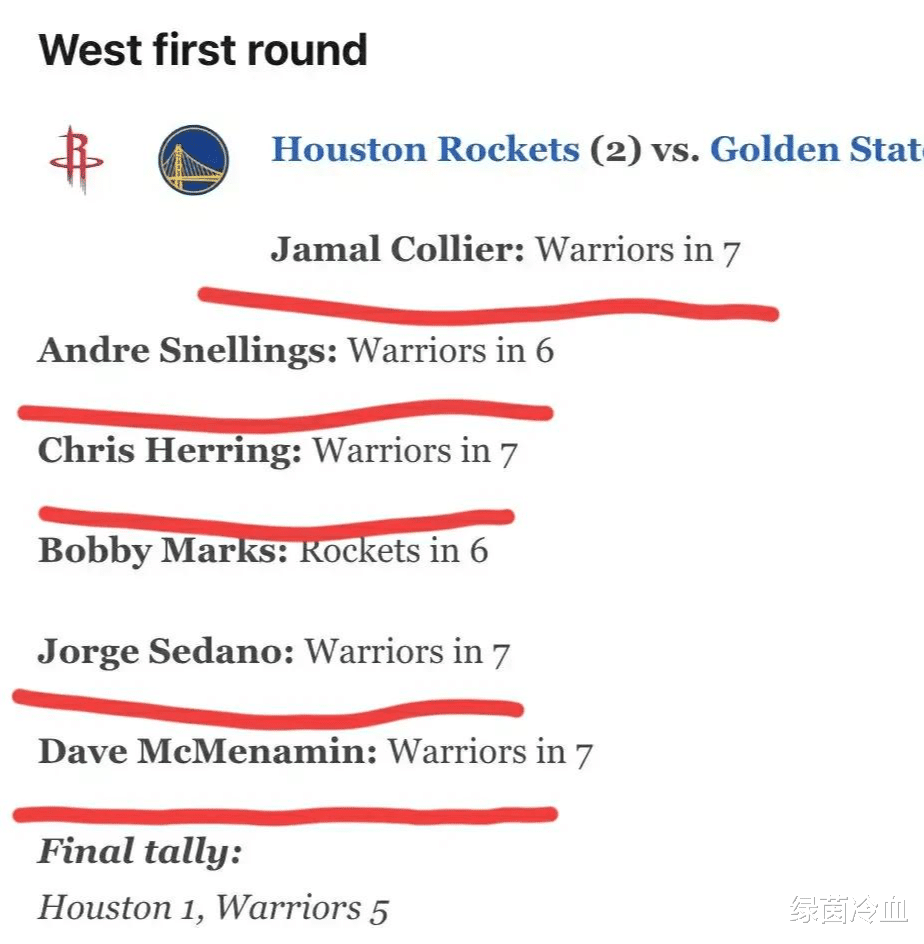 赛前不论是ESPN还是媒体都一致看好勇士队会战胜火箭队晋级第二轮。