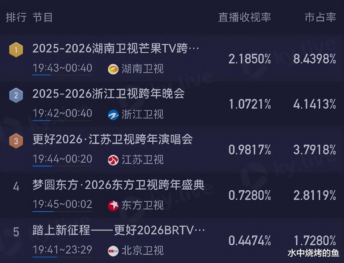 从晚会的收视来看,央视的地位无法撼动,国家级媒体平台的影响力和号召力摆在那里,庞大的受众人群也是收视保证。而在一众卫视里,湖南卫视依旧是大赢家,演唱会开播5分钟收视破1,稳居卫视收视冠军宝座,把其他卫视远远甩在了身后。