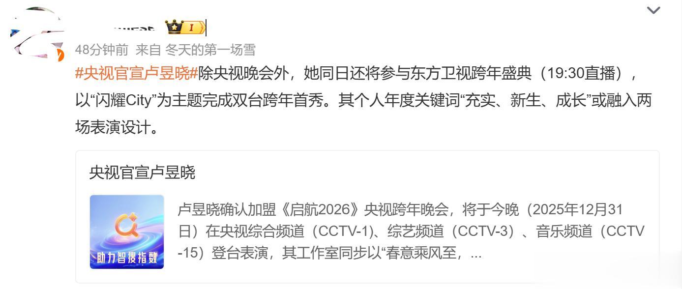 所以,2019年出道,2025年就已经可以在央视和东方卫视的舞台上进行跨年演出,怎么不算是2025年最大赢家呢。而且,卢昱晓从来都没有刻意地去营造人设,大势宣传自己,她只专注于自己的事业,低头做事,就像她父母所传达出来的爱意一样,绵密长远。