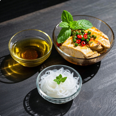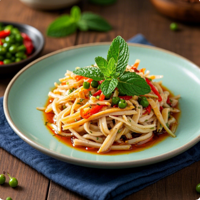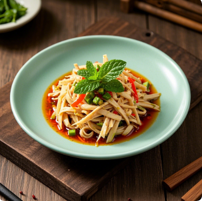 当藤椒的麻辣与薄荷的清凉在舌尖相遇,鸡胸肉的嫩滑与魔芋丝的 Q 弹交织出层次丰富的口感,这道藤椒薄荷拌鸡丝以鲜明的味觉对比与时尚的摆盘设计,成为夏日餐桌的焦点。低卡高蛋白的组合,既满足味蕾又兼顾健康,在炎热季节带来沁人心脾的味觉体验。