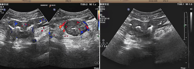 转诊至我院后,肠镜检查有了重要发现 —— 王女士肠道内存在不规则肿物,肿物表面出现溃烂出血的情况,还导致了肠腔狭窄。这一发现让病情的排查有了方向,随后超声科接诊,立即启动重点探查,力求更精准地了解病变情况。