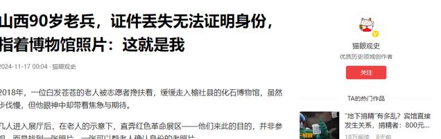 猫眼观史 2024.11.17 《山西90岁老兵,证件丢失无法证明身份,指着博物馆照片:这就是我》