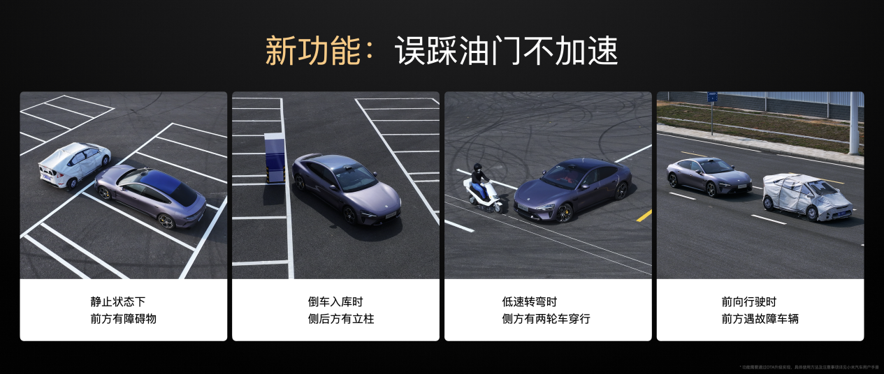 在赛道之外的城市日常场景中,小米SU7 Ultra也能提供极致的安全保障。小米SU7 Ultra配备了0速起步的误加速抑制辅助(MAI)功能(预计在后续OTA功能推送),实现了0-60km/h 全速域防护。该功能通过高精度传感器(摄像头、雷达)实时监测车辆周围环境,结合算法判断驾驶员的操作意图。当系统检测到误踩电门时,会瞬间抑制动力输出并联动AEB(自动紧急制动)刹停,避免碰撞风险。该误加速抑制辅助功能,可轻松应对停车场、狭窄街道等复杂环境,避免意外碰撞。
