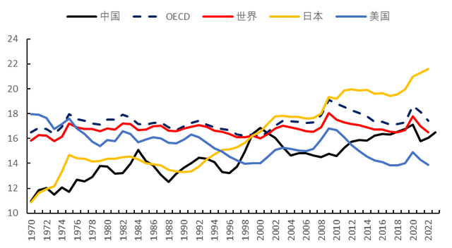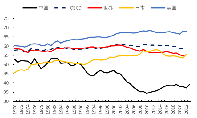 居民消费率较低导致中国内需不足。2023年,中国居民消费占GDP比重为39.2%,略高于2022年;但是,却远低于OECD经济体60%的平均值,也远低于55.3%的世界平均水平。美国、日本2022年居民消费占GDP比重分别为68%和55.6%。2023年,中国政府消费率16.5%,也低于OECD经济体18.3%的平均值和17.1%的世界平均水平,但差距较小。2024年,最终消费支出对国内生产总值增长贡献率降至44%;社会零售总额同比增速更是降至3.5%。消费对经济增长的制约愈发明显。